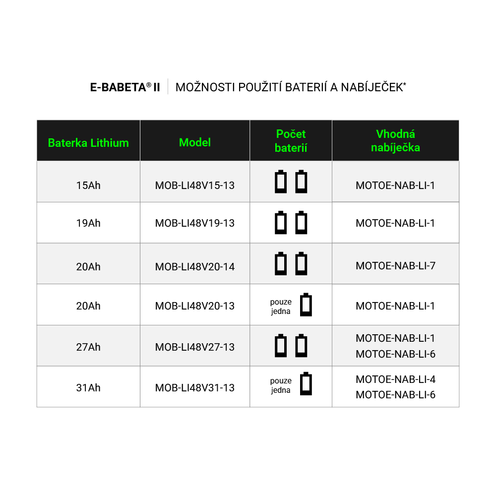 Skúter je vybaven už len LÍTIovou vyberateľnou batériou s kapacitou 19Ah, ktorú si môžete odniesť domov nabiť.Možnosti iných batérií a nabíjačiek objednáte v našom konfigurátore.